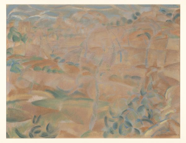 Wilson Irvine made this ethereal watercolor and graphite on paper, titled 'Impression of the Plains.' At first glance, the pastel palette and swirling forms seem abstract, almost divorced from the work of his hand. But if you look closely, you can see a figure emerge from the landscape, her form as mutable as the plains themselves. Irvine’s choice of watercolor is key, as it is an inherently fluid medium, hard to control, subject to gravity and chance. The marbling effect is not one easily mastered; it requires understanding the interactions between oil-based paints on a water surface, and is achieved by floating colors on top of a viscous solution, manipulating them into patterns, before carefully laying paper to lift the design. This process mirrors the precarity of life on the plains. Just as the artist coaxed his image from a chaotic process, settlers attempted to wrest a living from a landscape that was itself subject to constant change. It is not the romanticized, settled territory but an impermanent and somewhat unstable rendering of nature. In Irvine’s work, the idea of progress and control is questioned, as the land and its inhabitants remain in flux.