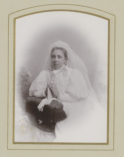 Curator: Ah, this photograph holds such delicate solemnity. The museum catalogs it as "Portret van een staande jonge vrouw in bruiskleding" or, in English, “Portrait of a Standing Young Woman in Bride's Clothing”. Created sometime between 1890 and 1920 by Doisen. Editor: Bride's clothing, but is she actually a bride? Or, more likely, about to attend First Communion? There’s such a dreamlike quality to this gelatin-silver print—a softness, almost like looking back at a memory through fog. Curator: It certainly has that nostalgic feel, doesn't it? The girl stands in full light, clasping what looks like a prayer book. But observe the composition more carefully. The hazy backdrop, those rather theatrical columns... everything feels quite staged. Editor: Staged, but deliberately so, I think. Consider the verticality here: the stark columns and even her rigid posture contribute to that sense. She almost melts into the stark background as it fights with the details of the veil. There is even that single pearl strand that draws the eye in, acting as a semiotic tool, of purity. Curator: It is really about contrasting surfaces isn't it. That said, the dress dominates the work. Its material appearance—from photographic values—looks so tactile in a manner not dissimilar to how Manet conveyed the dresses of his sitters. This image is, formally, playing with many layers and themes. Editor: Yes, the dress indeed holds the bulk of the semiotic potential, both drawing attention to her innocence, and also giving volume and gravity to a solemn day. However, there is no great complexity or innovation on show here. Curator: Perhaps not innovation, but rather quiet reflection and tradition. Looking at this image now I remember a feeling. Something wistful, for simpler times when taking a portrait really meant something. Editor: Perhaps that's its power. Even with the calculated composition, the haze and nostalgic qualities really manage to elicit emotional engagement, making me want to linger longer in those bygone days.
