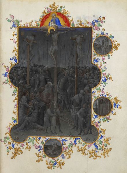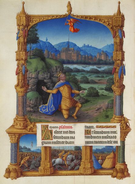 Curator: This artwork, possibly entitled "David's Victory", is attributed to the Limbourg brothers and appears to be executed in tempera on, quite unusually, textile. Editor: My first impression is the sheer density of detail – a swirling chaos that somehow coalesces into a surprisingly ordered scene. It feels both epic and strangely intimate. Curator: Indeed, it exemplifies the medieval aesthetic where flat perspective heightens the symbolic import of the characters over the landscape. And consider, this miniature would have been a luxury object, intensely private, intended for devotional contemplation. Editor: The level of artisanal labor embedded here is astonishing. Think about the preparation of the tempera, likely with pigments painstakingly derived from minerals or plants. The textile base itself represents a specialized craft and significant material value, and all that labor serves to reflect, even embody the patron’s wealth and power. Curator: The battlefield narrative seems to me less about depicting historical warfare, and more a stylized dance between virtue and vice. Notice how David, clad in glistening armor, seems untouched by the bloody carnage surrounding him. Editor: I find myself more captivated by those precise, individual spears piercing the horizon in the backdrop; their crafting a feat of standardized production to support the needs of knights and their entourages. To me, that reveals the socio-economic reality underpinning this idyllic battle. Curator: Ah, but doesn't that heighten the underlying message? Aren't the spears, that entire constructed vision, symbols within a divinely ordained framework of earthly power? A king's authority, sanctioned by the church, represented by the patron... it's a nested set of meanings. Editor: Perhaps. But it seems incomplete to overlook how art objects like this are produced through particular modes of production, reliant on materials, workshops, trade networks, skilled artisans. The battlefield and even David, however symbolic, were constructed, fabricated using human skills. Curator: An interesting tension, between material origin and spiritual destination! Looking at it this way, it makes this artwork feel like both an exquisite, and somehow humble, offering. Editor: Agreed! A nexus point where skilled production touches theological ambitions—creating complex material forms.