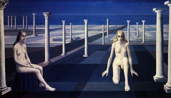 Editor: So, here we have Paul Delvaux's "Ruins of Selinunte" from 1973, made with oil paints. The juxtaposition of classical figures with industrial elements gives the artwork an eerie mood. What's your take on it? Curator: Consider the very materiality of Delvaux’s oil paint – the specific pigments he chose and how he layered them to create this somber, dreamlike space. Then, note the interplay of organic and inorganic: those regimented trees against the stark geometry of the railway and classical statuary. He’s deliberately blurring lines between the manufactured world and the natural one. Editor: How does this clash of materials and space reflect a Materialist point of view? Curator: For a Materialist, it is interesting to consider the means of production and display of these cultural objects, for instance. But it’s equally fascinating to explore what wasn’t chosen: the materials and processes Delvaux consciously rejected. Think about the socioeconomic implications of rail travel in the early 20th century compared to that of an artist working with oil paint. How do they relate and oppose each other? Editor: That's a really different way of seeing it! Looking at the art as if the socioeconomic situation reflects his work! So how the use of the classic statue is also clashing to the railway behind. Curator: Precisely. It makes you ponder what these seemingly disparate things share within the socio-economic landscape that birthed them. Art is always a product, but its meanings and purposes shift based on materials and context, both past and present. Editor: So, Delvaux isn't just creating an unsettling image. The materials themselves, along with their social history, actively create meaning? Curator: Exactly! Now we begin to understand how things are created, perceived, and their consumption. What do you think? Editor: I find myself viewing the piece less as a strange dreamscape and more as an archive, capturing and critiquing specific conditions of modernity, production, consumption, and decay. Curator: Yes. Considering our material realities reframes our view from "high art" to that of the maker and the means, allowing us to further deconstruct traditional art interpretations.