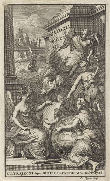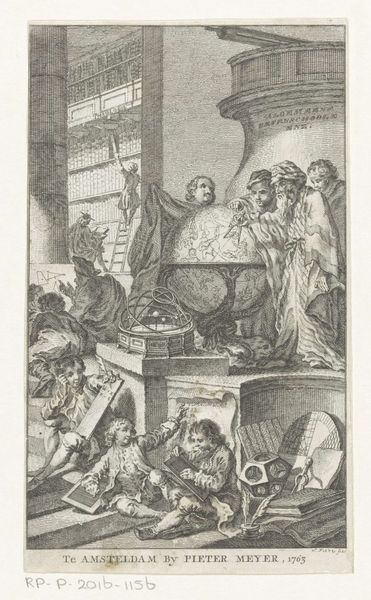 Curator: This delicate print, entitled "Frontispiece to a Treatise on Geography," is attributed to the British School. Editor: It feels like a celebration of knowledge, but also quite hierarchical, with the robed figures looming over the children. Curator: Indeed. This imagery likely reflects the era’s social structure and the politics of learning, specifically who had access. The print uses the visual language of enlightenment to reinforce existing power structures. Editor: And yet, there's a palpable sense of wonder. That figure reaching for the books seems determined to change the paradigm, wouldn’t you agree? Curator: Perhaps, but his access, mediated by social forces, highlights how privilege intersects with knowledge acquisition. Editor: Still, considering the dimensions, the details are captivating. It’s a small window into a much larger world. Curator: Agreed. Analyzing the visual rhetoric in relation to the time it was made unveils critical questions about education and societal power structures.