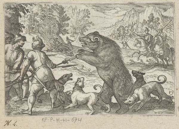 Curator: This compelling engraving, entitled "Skjold's Fight with the Bear," was created in 1852 by H.C. Henneberg. Its graphic detail really leaps out at you. Editor: Absolutely, there's a palpable sense of contained ferocity. The contrast of dark and light areas draws my eye immediately to the struggle at the work's center. Curator: The piece leverages line work so effectively to convey depth and motion, which directs your attention to the critical aspects of the visual narrative unfolding before us. Editor: Considering the legend of Skjold, this encounter with the bear acts as a symbolic passage, an almost mythic representation of his strength, a demonstration of leadership by brute force. The surrounding figures react with a mixture of fear and awe. Curator: Observe how Henneberg positions Skjold. The compression of the hero and beast establishes a physical relationship between the men, emphasizing the material contest between human order and primal nature. It makes excellent use of closed composition and high contrast. Editor: You’re right; the bear isn’t just a literal bear, is it? It stands for wild, untamed power and hints at themes of man conquering beasts. It seems there's an assumption of divine power granted through the violent struggle with forces of nature. Curator: Precisely. The artist manipulates line and shadow, structuring depth through calculated strokes in order to generate complex relationships of space that speak beyond simple representation. Look at the decorative framing elements to guide the eye within. Editor: So, is this work more about societal legitimization? It uses the power of these old images and symbols to validate a social narrative or historical precedent? Curator: One could view this print as precisely that; form becoming synonymous with function as historical record. A careful examination reveals so much calculation... Editor: Thank you, it's always helpful to analyze those assumed functions and read between the lines, considering how our interpretation colors them with further symbolism.