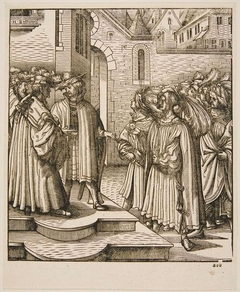 Curator: This print, currently residing in the Harvard Art Museums, is by Leonhard Beck, dating back to the early 16th century. It's titled "The Old White King and the Queen Receiving the Holy Sacrament." Editor: My initial impression is one of stiff formality. The scene feels very staged, almost theatrical with those elaborate robes. Curator: Absolutely, the woodcut medium lends itself to a certain rigidity. Look closely at the dense, cross-hatched lines defining the textures of the garments, it speaks volumes about the labor involved. Each line carefully carved, each impression precisely made. Editor: And it's not just aesthetic, is it? The materiality of these clothes signifies wealth and power. The fact that the artist put in so much detail in it is a testament to the social meaning of clothing. It's interesting to think about who this print was made for and its circulation within those social circles. Curator: Indeed. You can almost feel the weight of those textiles pressing down, a visual metaphor for the burdens of rule perhaps? It's that tension between the spiritual moment and the earthly display that I find so compelling. Editor: Right. I hadn't considered how the woodcut itself, as a replicable medium, democratizes a scene of royal exclusivity. Curator: It’s a fascinating paradox. Something to ponder, isn't it?