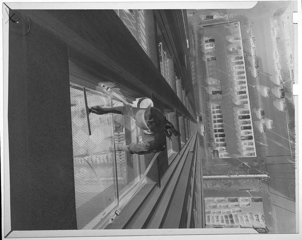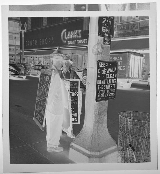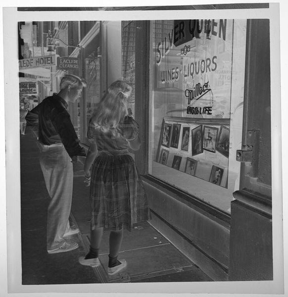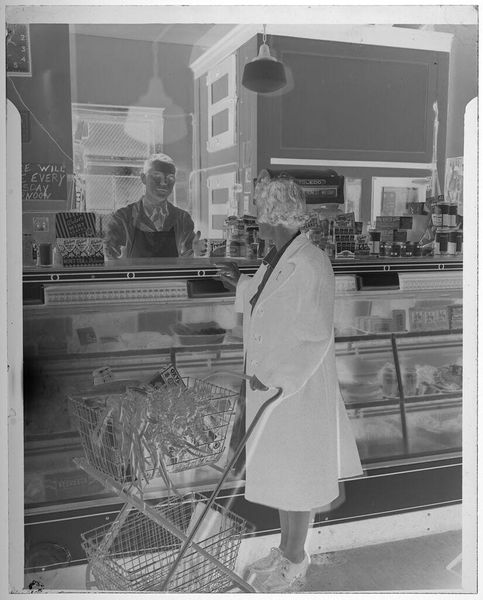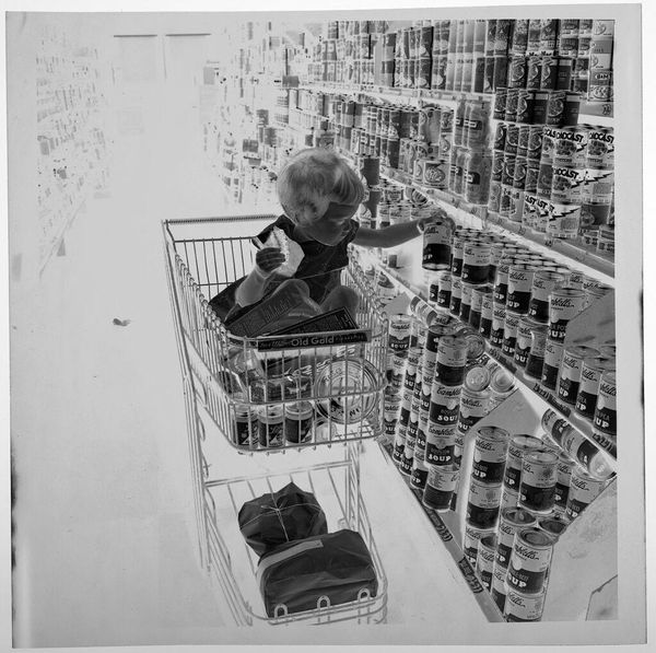 Editor: This photograph by Jack Gould is called "Untitled (child looking at goods on grocery store shelf)." It's a small, square print, and the stark negative creates an almost dreamlike feeling. What do you see in it? Curator: Ah, a little ghost in the machine of consumerism. It speaks volumes, doesn't it? It’s about innocence peering into a world of processed promises. I wonder what captured Gould's eye here. Is it the child's curiosity, or the allure of the supermarket spectacle itself? It makes me think of my own childhood grocery store memories. Editor: It's interesting how the negative transforms the ordinary into something a little unsettling. Curator: Exactly! And isn't that what art should do? Take the everyday and show us something new.
