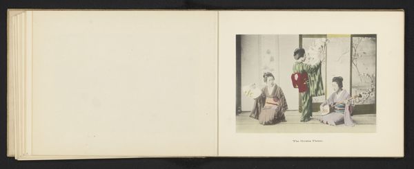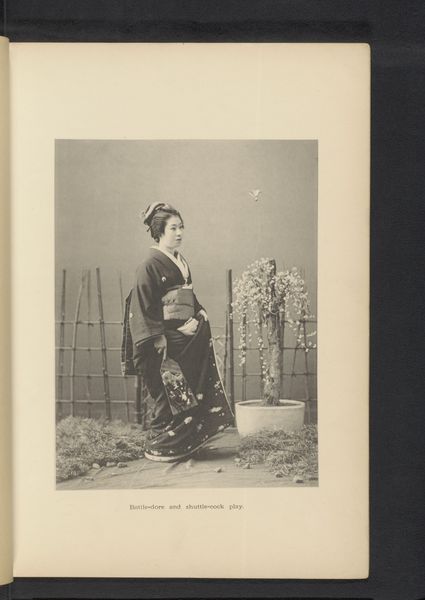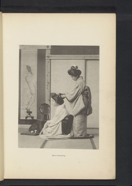 This photograph of two unknown Japanese girls in traditional clothing was taken by Kazumasa Ogawa. Ogawa's photogravure captures not just an image, but also the labor and artistry embedded within the kimonos. The standing figure’s garment, with its intricate floral pattern, speaks to the skilled traditions of textile design, weaving, and dyeing. The very making of such elaborate clothing was a specialized craft, indicative of a hierarchical society with a refined aesthetic sense. These textiles are heavy with cultural significance. These garments reflect the amount of work involved in the production process and are tied to wider social issues of labor, class, and consumption. The image also prompts us to consider the lives of the artisans who produced these garments and their place in society. Looking closely at the materials, making, and context allows us to appreciate the full meaning of the photograph.