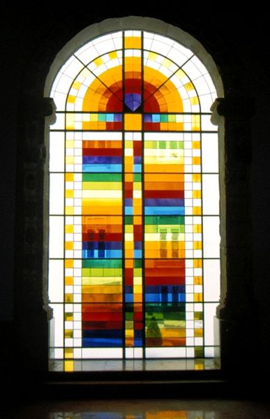 Curator: Looking at Igreja de S. Miguel, Queijas, created by Eduardo Nery in 1992, I’m immediately struck by the geometric shapes used in the design. What are your first impressions? Editor: It reminds me of sunlight filtering through a kaleidoscope. The circular pattern at the top, rendered in yellows and blues, immediately catches the eye, while the lower portion's grid creates an interesting interplay of light and shadow. It looks quite meticulously crafted. Curator: That's a keen observation. Considering the setting—a church—it prompts a question about spirituality and representation. Does the modernist geometry serve as a way to symbolize transcendence? How does it reflect religious experience within a contemporary framework? Editor: That’s an intriguing way to put it. To me, it feels more like a meditation on light itself, a natural phenomenon elevated by human artistry. Knowing it's made of glass underscores that, given its history and use in crafting optical tools. I'm curious about how the different colors were obtained and their effects on how natural light fills the space. Curator: Agreed. Beyond the immediate visual impact, the artwork speaks to shifting religious identities in the late 20th century. We could consider if geometric abstraction allowed the faithful to approach the divine without reliance on conventional, figurative symbols. It also subtly reflects a shift in the relationship between religious authority, architectural forms, and contemporary values during that era. Editor: So, in this context, Nery seems to propose a shift in how religious spaces could be designed. Thinking materially, there’s the craft. Glasswork is laborious, specialized labor. The work’s impact likely has to do with the workers, architects, commissioners and their understanding. And, how that understanding manifests for viewers in a shared, material-built setting such as a church. Curator: Ultimately, what we see is the result of a society, time and artistic perspective. Thinking beyond conventional art discourse, its placement as a religious object adds several more interpretive layers. Editor: Right, because seeing it here allows us to reflect not only on aesthetics, but on labor, faith, and how these factors impact perception itself.