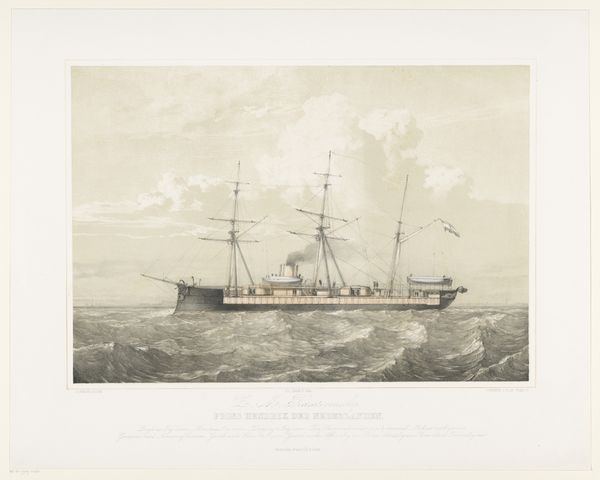 Nathaniel Currier created this lithograph titled "The Chinese Junk 'Keying'" in 1847. The overall composition presents a detailed view of the ship, emphasizing its structure and form. The use of line is particularly striking. Currier employs precise, delicate lines to define the ship's rigging, hull, and decorative elements. The contrast between the dark lines and the white of the paper creates a sense of depth and volume. The formal arrangement of geometric shapes, especially the squares along the ship's side, introduces a pattern that is both decorative and structural. The eye is led along the horizontal axis of the ship, yet also upwards towards the masts and flags. Historically, this print documents a specific moment—the arrival of a Chinese junk in New York Harbor. Structurally, the work invites us to consider how cultural artifacts are represented and perceived. This lithograph is not just a depiction of a ship, but also an artifact of cultural exchange. Ultimately, it's a study in contrasts, between East and West, line and form, and historical event and artistic representation.