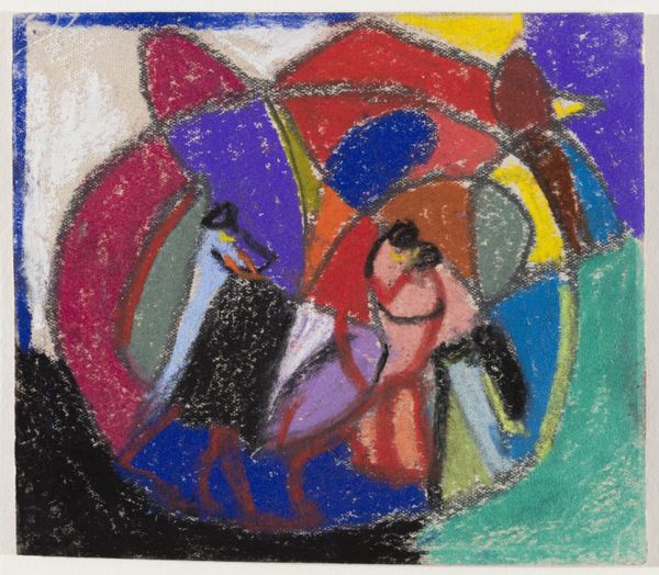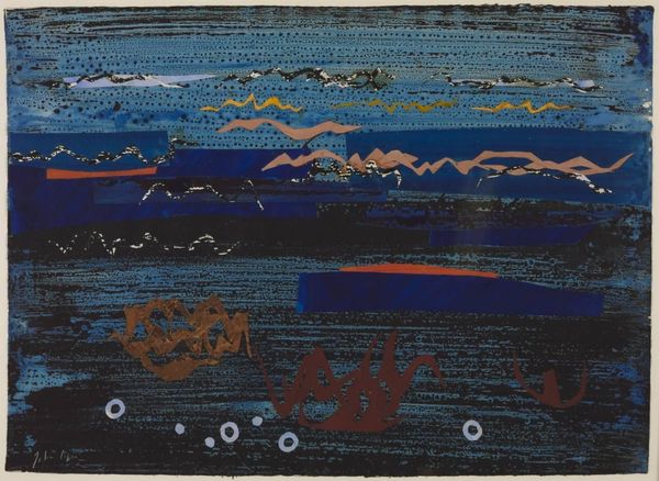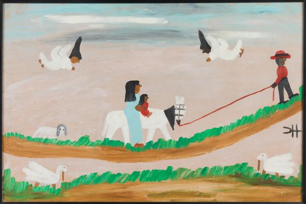 Curator: Looking at this vibrant scene, it immediately evokes a sense of community and labor. Editor: Indeed. The oil painting titled "Fishing," created by Clementine Hunter in 1966, presents a bustling scene of several boats each carrying two figures actively fishing. The landscape elements are reduced to simplified forms of water, sky and what appears to be the edge of a marsh. Curator: The bold color palette and flattened perspective remind me of folk traditions, challenging notions of fine art. It evokes a complex discourse around race and the romanticized image of the rural South, doesn't it? Editor: Precisely. Her distinctive application of impasto provides each element a tactile quality. The focus seems to be less on the specific rendering of depth, or an elevated approach to her supplies, and more on presenting fishing as work, even in such calm surroundings. The boats, sky, water – these all seem to conform to her use of house paint from her employer. Curator: Absolutely. We must recognize that her practice reflects the material realities and limited resources available to her. The directness, for me, speaks to a narrative tradition of African American storytelling, passed down orally and visualized through her brush. It's vital we see her use of fishing not just as an individual act, but as tied to collective experiences, survival, and a deep connection to place. These activities reinforce ties. Editor: Hunter’s compositions certainly suggest those activities sustain the ties as much as providing basic sustenance, but I still cannot look away from the raw fact that the scene is composed primarily of accessible paint from the service she performed on the plantation. This gives context to how art may exist beyond just high societal aspirations of consumption. Curator: To step back, let us consider this in the intersectional scope: Clementine Hunter's folk art operates as resistance, a visual language created outside of formal academic structures. This genre painting becomes an important document of labor, resistance, and the everyday lives of Black people in the Jim Crow South. This isn't a detached observation but a passionate claiming of space and narrative. Editor: I agree entirely. I came seeking commentary on its simple construction, yet realize the beauty comes from a space born from struggle and material, accessible context.