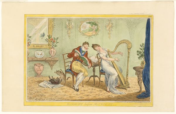 John Cawse created this print, "General Jacko & his Rib," using etching and stipple engraving. The scene presents a woman reclining on a yellow couch, embraced by a monkey dressed in military attire. The bright colours and caricatured forms immediately strike the eye. The composition is structured around contrasting textures: the smooth skin of the woman, the soft fabric of her dress, and the coarse fur of the monkey. These formal elements create a tension that destabilizes traditional representations of beauty and power. The monkey's uniform and posture mock military authority, while the woman's relaxed pose challenges conventional ideas of femininity. The use of animalistic imagery here links to broader philosophical debates about human nature and social hierarchy. Cawse's print reflects the period's fascination with physiognomy, where physical features were thought to reveal inner character. The juxtaposition of human and animal traits blurs established categories. Art like this encourages us to question the codes and conventions through which we perceive the world.
