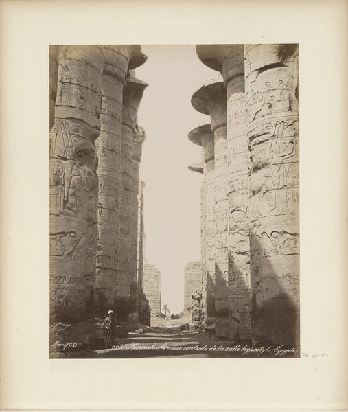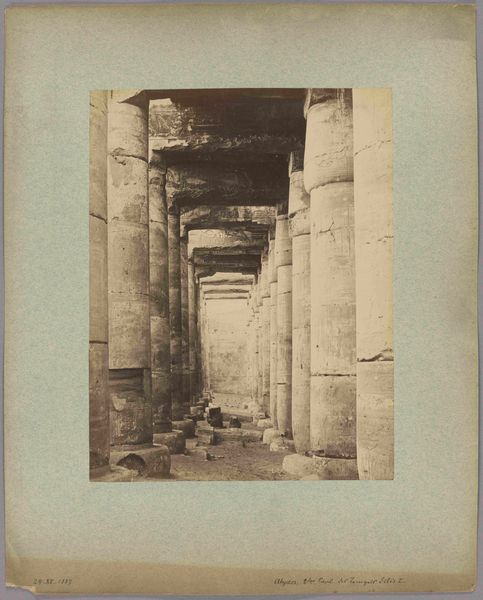 Editor: This photograph, "Abydos, Temple of Sethi I., Columns of the Second Hall, No. 158bis," taken between 1870 and 1880 by Pascal Sébah, presents a seemingly endless row of massive columns. They’re really striking. What’s your take on why this image endures, given the era in which it was made? Curator: Well, consider the late 19th century fascination with documenting and, in a sense, possessing the past, particularly in places like Egypt. This albumen print isn’t just a landscape or architectural study, but a product of Western engagement with ancient cultures. How do you think the museum as an institution, both then and now, plays a role in shaping our understanding of such a photograph? Editor: I suppose the museum validates its historical significance and filters its meaning for the public. Does that validation risk romanticizing a colonial perspective, perhaps overshadowing the complex political landscape of the time this was taken? Curator: Precisely! Photography became a tool for European powers to survey and classify other cultures, contributing to a visual archive that legitimized their influence. Sébah was a Levantine photographer of Armenian descent. His positioning is quite interesting considering Egypt was experiencing major social transformations during his time, experiencing colonialism and post-colonial independence movements. I would suggest you consider this in order to think through photography, architecture, and the state. Do you agree with that? Editor: Yes, it seems vital to acknowledge this broader political and social context when viewing Sébah's photograph. It challenges a purely aesthetic reading. This also forces me to realize there are layers upon layers that the public must realize when experiencing the arts. Curator: Absolutely. Thinking about photography from these perspectives makes me more cognizant of the photographer as both an interpreter and product of his milieu, and what that says about the larger political landscape of the time. Editor: Thanks! It gives the photo a lot more weight, and provides important contextual detail, especially for the public viewing.