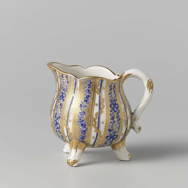 This creamer was crafted by Tiffany & Co. with silver and enamel. The eye is immediately drawn to its intricate decorations and form, where floral motifs contrast with rigid geometric borders. The overall shape of the creamer is a study in contrasts: a smooth, curved body that meets a sharply angled spout. The handle, too, offers a play between function and form, its tightly wound design providing both grip and visual interest. Looking at the object through the lens of structuralism, we might consider how the combination of floral patterns and geometric lines creates a semiotic tension, reflecting the structured and ordered yet organic character of the Gilded Age. The contrast between the natural and the artificial becomes a key point for interpretation. Consider how the materiality of silver and enamel contributes to its reception. These materials, valued for their luxurious sheen and durability, speak to a culture preoccupied with both beauty and permanence. It's not simply an object but a statement of cultural values.