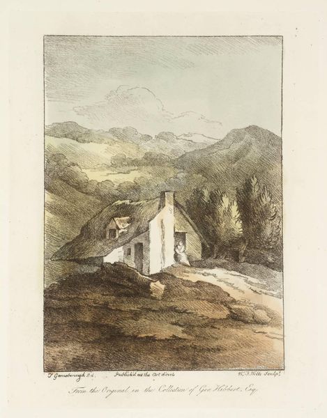 Editor: So, here we have "A Cottage beneath Mountains" by Thomas Richard Underwood, dating back to the late 18th or early 19th century, done with watercolor on paper. It feels a bit lonely, maybe? What do you see in it? Curator: Lonely, yes, but also safe somehow. Underwood captures the sublime in miniature—that cottage nestled against the imposing mountains. It's like a whisper of domesticity against nature's grand roar. Do you feel the contrast in the textures? Editor: Definitely! The rough mountain versus the smooth cottage walls. Curator: Precisely. And the light! See how it softens the landscape, almost like a memory. It makes me wonder what stories that cottage holds. Editor: I never thought of it that way. It's like the cottage is telling its own little story against the backdrop of the mountains. Curator: Exactly! Art is a conversation, isn’t it? Underwood starts it, and we continue it.
