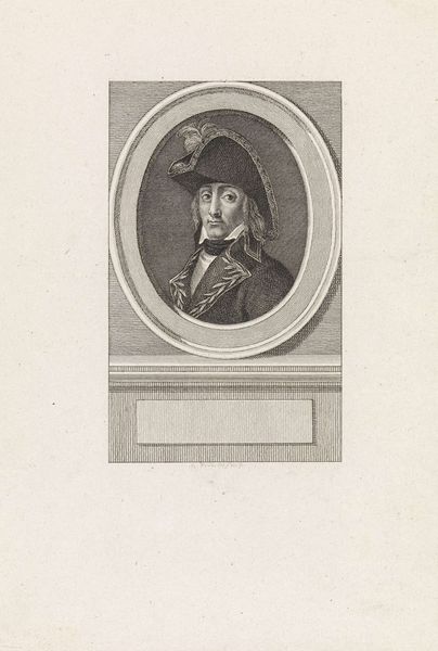Editor: Here we have "Portret van Dietrich von Keyserling", dating from around 1762 to 1833, an engraving by Meno Haas. The detail achieved with engraving is stunning! It seems the texture is almost trying to replicate the look of woven cloth. What strikes you most about this piece? Curator: What immediately captures my attention is the structural interplay between the portrait and its surrounding framework. Notice how the oval frame containing Dietrich von Keyserling is positioned against the gridded background, establishing a dialogue between organic form and geometric abstraction. Editor: So, you’re saying it's not just about *who* he is, but how the artist uses shapes and lines? Curator: Precisely. Observe also how the engraving technique itself contributes to this formal tension. The density and directionality of the lines create variations in tone and texture, adding depth to the composition while simultaneously highlighting its two-dimensional nature. The inscription panel below further emphasizes the structural division within the overall design. Do you see the small ‘2’ in the upper right corner? It hints that this image exists in conversation with an outside series or larger body of work. Editor: Ah, yes! I see that now. It’s easy to overlook the geometric patterns when you get caught up in the detail of the portrait itself. So, what you're calling "structural divisions" can also function to show it is part of a larger body of work, adding significance to the overall piece? Curator: Precisely. Analyzing these elements allows us to appreciate the formal complexity and conceptual rigor inherent in the work, independent of its representational content. Editor: I’ve never considered analyzing art quite like that before! I guess I have a lot more to learn about form and structure. Thanks for broadening my perspective. Curator: A pleasure! And it highlights the enriching perspectives derived from simply looking.