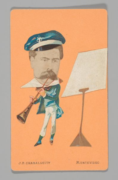 Curator: At first glance, it's playful but the composition feels awkward somehow. A tiny body topped with an oversized, stern face. Editor: This is "[Photo Collage: Musical Conductor]" by Juan Pedro Chabalgoity, dating from somewhere between 1870 and 1880. It's a print, incorporating photography, currently held at the Metropolitan Museum of Art. The charm lies in how Chabalgoity embraces collage – quite literally assembling an image. What processes would have been involved to achieve this effect? What choices determined the final materiality? Curator: It seems so…self-aware. That incongruity is definitely part of its appeal. Think of how photographic portraiture was becoming increasingly accessible, but still retained an aura of authority. By combining it with this almost cartoonish body, is Chabalgoity critiquing the seriousness we typically project onto such images? The uniform is very purposefully chosen as well. It holds symbolic value for civic and patriotic themes during the rise of Nationalism. Editor: Precisely. And let's consider the format – most likely a carte de visite or a cabinet card, affordable and collectible. To juxtapose the face of authority and leadership on this small mass produced and traded card seems provocative to me, even challenging ideas about the social mobility that photography was enabling, no? We’re looking at very deliberate acts of cutting, pasting, and reproducing this image, so I would wonder at its impact on viewership at the time of production. Curator: I agree, that's a fantastic point. This smallness almost democratizes the image, rendering it less intimidating. Even the awkwardness plays into it – undermining any potential for stuffiness. The image reads less like a monument, more like a mischievous caricature of power. The face of the subject looks quite intimidating in contrast to this childish playful form, perhaps symbolizing authority with playful yet authoritarian tones. Editor: Exactly! Its composite nature – the fact that it's made of tangible bits and pieces and materials assembled– that’s key. It reveals its constructedness, pulling back the curtain on image-making itself. In contrast, nowadays, digitally constructed pictures are seamless and pervasive; we take them for granted. In that case, does it reveal even more in modern viewership about what we understand as "authenticity" when looking at a photograph? Curator: So, in our modern age of seamless images, perhaps Chabalgoity's creation reminds us that all images, no matter how "real," are inherently constructions, imbued with symbols and cultural values? Editor: I’d say so. And it reminds us to consider the hand, the labor, the choices in every constructed reality we encounter, from the 1870s to now.