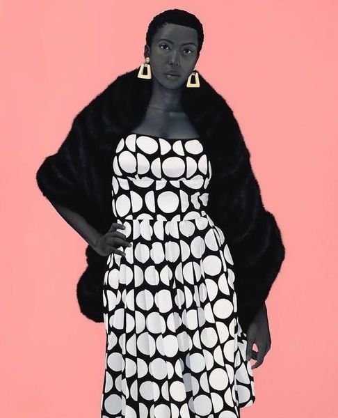 Curator: Amy Sherald painted this arresting portrait in 2018. It’s titled “She had an inside and an outside now and suddenly she knew how not to mix them." Editor: The flatness of the image immediately strikes me. It's so deliberate. Acrylic on canvas, yes? I imagine that texture really emphasizes the artifice. Curator: Precisely. And consider the symbolic weight of those grey-scaled features against the bold clothing. It’s classic Sherald, challenging how we perceive identity. Editor: Absolutely. Her material choices amplify that, right? The paint application itself lacks depth; there’s minimal blending to create volume. Instead, she emphasizes line and color blocking. I’m also drawn to the floral fabric on her pants. The material signifies consumerism and taste. What does it suggest to you? Curator: I think it speaks volumes. The flowers contrast sharply with the subject's monochrome skin. Perhaps the blooms represent her vibrant inner self finally coming into harmony with her public presentation. Those pearls are fascinating, too. Editor: Those faux pearls have such an interesting relationship to the body; they draw attention to artifice but read as a signifier of feminine presentation through a very mass-produced item. Curator: You’ve reminded me that within some cultures, pearls represent purity and wisdom, reflecting a certain social performance that might weigh on the subject. She "knows how not to mix them," yet the outward signs of material wealth are displayed in this portrait. Editor: Exactly. So how much of this is actually controlled by her or informed by external perceptions? The flat background color – the way she creates the image – emphasizes this detachment, suggesting a critique of the external pressures influencing her identity. The flatness undermines any illusion. It’s an incredibly contemporary take, forcing the viewer to grapple with surface versus substance. Curator: It does feel almost iconographic, doesn’t it? An image designed for contemplation, its simplicity urging us to confront deeply embedded societal expectations. The painting makes a powerful statement about what it means to navigate interior and exterior identities. Editor: It reframes "identity," I believe, within the systems that define it.