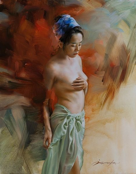 Kun Wang's oil painting presents a woman, adorned with a floral headscarf, her gaze turned inward. This head covering, blooming with botanical motifs, speaks of modesty, yet it echoes a lineage far beyond mere adornment. Consider the veils of Renaissance Madonnas or the turbans of Persian miniatures. They re-emerge here, transcending religious or cultural specificity. In the ancient world, head coverings symbolized status and piety. Over time, their significance has ebbed and flowed. The headscarf, historically a marker of respect, in this painting cloaks the woman’s thoughts, inviting contemplation. The gesture of her embrace mirrors the Venus Pudica—a pose of modesty. What is it that she conceals? Perhaps not the body, but a deeper, more intimate vulnerability. It’s a visual language of the soul, one that transcends the immediate moment, engaging us on a subconscious level. This evolution, a kind of palimpsest of meaning, shows how potent symbols are constantly shifting in meaning, reminding us of the cyclical nature of cultural memory.