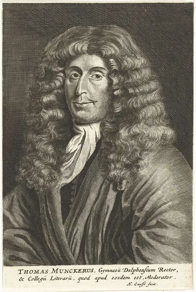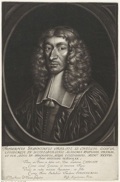 Curator: I'm immediately drawn to the serious countenance and intensity emanating from the eyes. There’s a depth that feels probing and introspective. Editor: We’re looking at “Portret van de theoloog Antonius Cregutus,” an engraving by Jan van Somer. Its creation is dated sometime between 1655 and 1693. The details highlight the sitter's profession – D. et Professor SS. Theologiae – hinting at a deeper engagement with faith and knowledge, even now. Curator: That textual inclusion is interesting; it literally frames him within the discourse of theology and intellectualism. Did these titles also reflect access or barriers based on identities such as race or gender in this historical moment? What perspectives were inherently excluded from these theological discussions? Editor: Absolutely. Cregutus lived in a time of immense social and religious upheaval. Analyzing the context is important: Consider the immense power held by religious figures, and the sociopolitical implications tied to their roles during this era of colonial expansion. Van Somer’s technique employs precise lines to construct Cregutus’s form, while simultaneously upholding those power dynamics. Curator: The subject's gaze, seemingly fixed upon the viewer, feels deliberate, demanding consideration beyond a surface-level glance. I am forced to think of the gaze and consider, what does it mean that Cregutus—presumably, a person of stature within the dominant group—is given this platform? How do such depictions of power uphold or challenge existing social hierarchies of the time, and who benefits? Editor: Precisely. The engraving becomes more than a mere likeness; it's a curated statement, embedded within societal structures and discourses. Portraits such as this played a vital role in shaping the visual culture and perception of power and influence during the Dutch Golden Age, and how theology was framed. Curator: Indeed, this allows for a conversation about how representations of authority operate – not just as images, but as active participants in maintaining particular ways of thinking and ordering the world. It provokes questions about agency and who holds the authority to be seen, and, conversely, unseen. Editor: That's insightful. Reflecting on the artwork, it underlines that even seemingly straightforward portraits can open pathways into exploring complex intersections of power, representation, and societal frameworks.