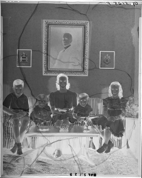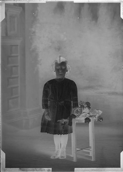 Curator: Well, this is quite the little ghost, isn't it? Editor: Indeed, this undated portrait, attributed to Durette Studio, shows a small boy standing beside a craftsman-style chair. The image is a photographic negative. Curator: The chair is a strange totem, almost as if he's laying claim to domesticity, a life he can barely grasp yet. The knitted cap makes him look so vulnerable. Editor: Children in portraits often hold symbolic objects. The chair here signifies stability and belonging, but the negative print lends a ghostly, ephemeral quality. Curator: I feel the transience of childhood acutely, looking at this. All those fleeting moments we try to pin down and inevitably lose. Editor: Yes, the interplay between the boy's small figure and the stark chair creates a powerful contrast, a sense of innocence poised on the edge of something more permanent. Curator: It's a captured fragment, a bittersweet echo. Editor: One that continues to resonate with shifting meanings.