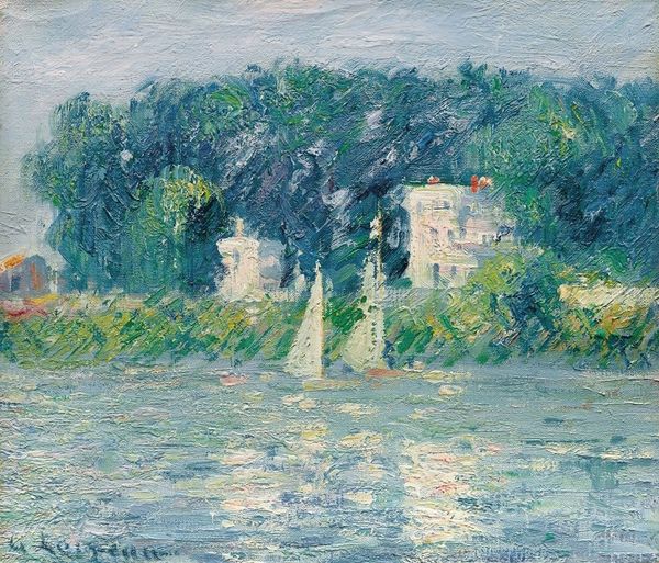 Editor: Here we have Henri Lebasque's "Péniches Au Bord De La Marne" from 1905, an oil painting that really captures the light on the water. The brushstrokes feel so free, almost like the scene is shimmering. What do you see in this piece, what resonates with you? Curator: Immediately, I'm drawn to the reflections. Notice how Lebasque mirrors the buildings, sky, and even the trees in the Marne. In many cultures, reflections represent a deeper understanding, a truth beyond the surface. Could the artist be hinting at a desire for the viewer to contemplate more than just the beautiful landscape? Editor: That's a fascinating idea. I mostly saw it as a snapshot of daily life, but the idea of seeking a deeper meaning is intriguing. Is that common in Impressionist or Post-Impressionist works? Curator: Indeed. The Post-Impressionists, in particular, moved away from merely capturing a fleeting moment, as the Impressionists did. They imbued their work with emotional and symbolic content. Even something as simple as the specific colours used, like the predominant oranges and yellows here, could suggest warmth, vitality, but perhaps also a touch of melancholy, considering the historical context of pre-war Europe. Editor: Melancholy? I wouldn't have thought of that looking at those colours, but I see your point about pre-war context and meaning. It really adds another layer. Curator: Consider how the barges, or "péniches", were the workhorses of the river, essential for trade and transport. They symbolize labour, movement, and the interconnectedness of society. Lebasque uses visible brushstrokes, thick impasto to depict the water. Do you notice this technique, how does that strike you? Editor: Yes! The texture brings a sense of materiality, the physical reality of the scene. It's not just an illusion. It's a world you could almost touch. I see how he layered those warm colors throughout. Curator: Exactly. Perhaps, then, this painting functions as a potent reminder of simpler times, while subtly hinting at the coming changes that would sweep away the old world order. Editor: I hadn't considered it that way at all. Thanks so much for opening my eyes to those symbolic and cultural layers. Curator: It’s been a pleasure. Each artwork is like a time capsule, filled with stories waiting to be discovered.