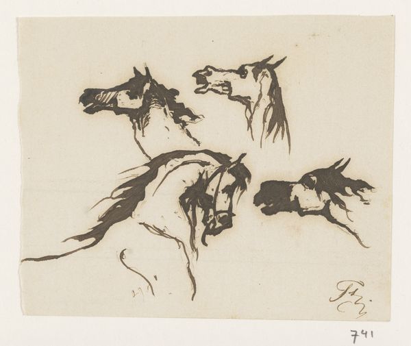 Editor: This drawing, “Studies van wolven,” by Johannes Tavenraat, created sometime between 1840 and 1880, is remarkable. The various wolf figures, rendered in ink, almost appear to float across the page. It feels like the artist captured different moods and attitudes using such simple means. What do you make of this piece? Curator: Indeed. Observe the confident lines, particularly defining the contours of the animals. Note the deliberate use of hatching and cross-hatching to suggest form and shadow, though without fully committing to realism. Do you see how the blank space functions almost as an active element within the composition? Editor: I do. It keeps it feeling like a study, and not a complete picture. How intentional do you think that was? Curator: Precisely. One cannot be certain of the artist’s intent. However, this deliberate withholding of complete pictorial information—the incomplete background, the varied level of detail in each wolf—invites the viewer to participate, to complete the image in their mind. This is sophisticated control of pictorial space and line. The artist prioritized line as the carrier of meaning. Note the variation of each study -- does that variation itself signify? Editor: I see what you mean. The composition encourages you to focus on the wolves themselves, rather than a narrative context. Perhaps the variation is just exploring form and attitude. Curator: Precisely. The piece prompts us to consider the essence of the animal, isolated from external narratives. Ultimately, it directs us to examine how the artist orchestrates form, line, and space. Editor: That's fascinating! It shifted my perspective from thinking about *what* is represented to *how* it’s represented, which made me see a different value in the study. Curator: An insightful observation, demonstrating the profound potential of formal analysis.