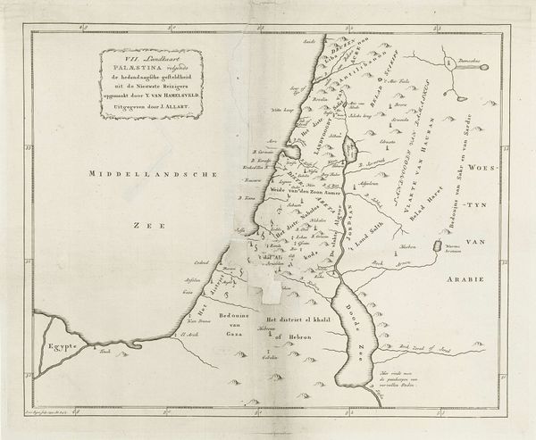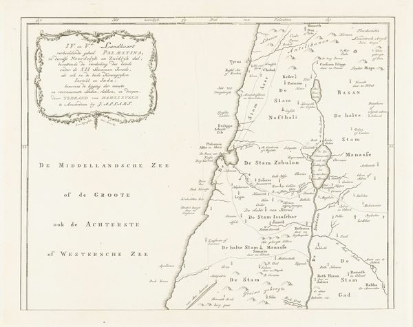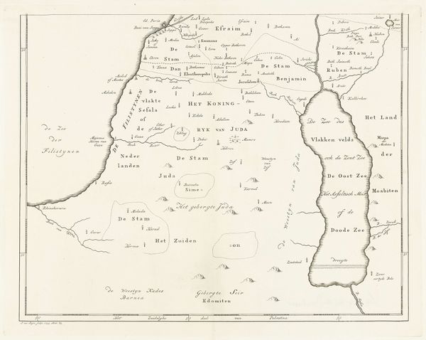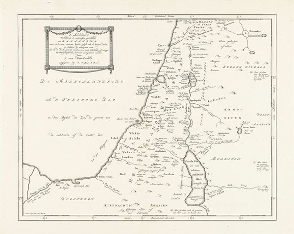This map of Israel was made by Jan van Jagen, likely in the mid- to late-1700s, using engraving techniques. The map depicts the region during the reigns of Saul, David, and Solomon, reflecting a historical and perhaps religious understanding of the territory. Consider the cultural context of map-making in 18th-century Europe, particularly in the Netherlands, where cartography was a highly developed art and science. Maps weren’t just about geographical accuracy. They were tied to power, trade, and religious identity. The map's focus on ancient Israel suggests an interest in biblical history, possibly linked to the Dutch Republic's Protestant identity and its relationship to the Holy Land. The inclusion of various tribal lands and regions reflects a desire to categorize and understand the complex political landscape of the area. To fully understand the map, we can explore the history of Dutch cartography, religious attitudes toward the Holy Land, and the political dynamics of the time. By researching these elements, we can better appreciate the map as a cultural artifact shaped by specific social and institutional forces.
