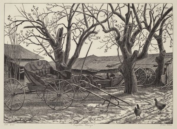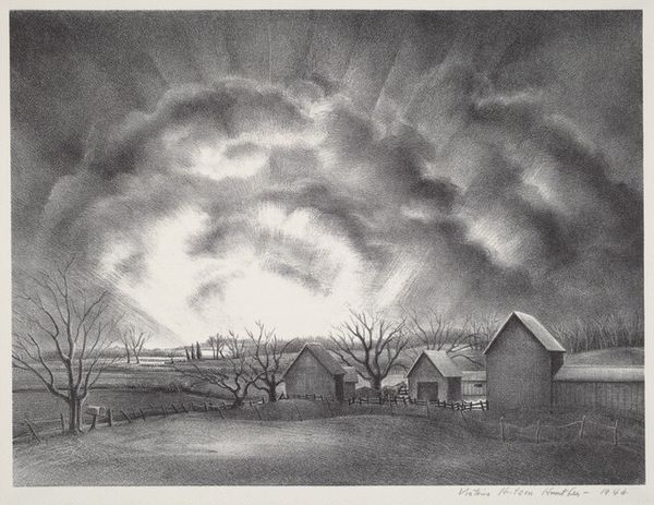 Editor: This print, "Farm Scene," by Gustaf Oscar Dalstrom, created in 1932, has such an interesting texture. It's a pretty classic pastoral landscape. The cows and the slightly menacing sky make me wonder though... what are we meant to think about this idyllic image? Curator: That’s a great observation. This seemingly simple farm scene exists within a very specific moment in American history. The 1930s were, of course, dominated by the Great Depression. How do you think the social context could inform the interpretation of the landscape? Editor: Maybe the “realism” points to a certain… desperation? Like, these are real farms that need to survive? It seems that art had to show real people to resonate with the society back then. Curator: Exactly. Many artists at the time turned towards realistic depictions of American life, often focusing on rural scenes like this one. This wasn't just about artistic style, it was about making art that was relevant and accessible to the struggling population. This imagery promoted ideas of national resilience during the Great Depression. Consider how prints allowed artwork to become accessible, affordable, and thus widely distributed, thereby cementing an understanding of identity and community. Editor: That's so interesting. So even a seemingly simple farm scene could carry political weight and serve an important social function. I wouldn’t have expected it. Curator: Yes, understanding the historical and social context transforms how we perceive seemingly conventional landscapes. Editor: I’ll definitely think differently about prints from this period from now on. Thank you for putting things into perspective.