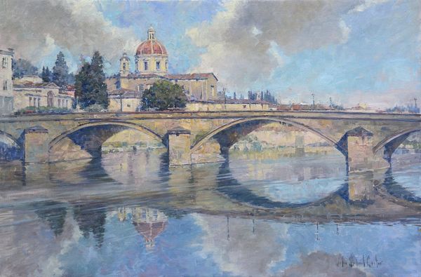 Curator: What strikes me immediately is the tranquility. Despite being a cityscape, there's a sense of peace radiating from the canvas. The cool tones of the water and sky are really soothing. Editor: We are looking at a work entitled "Le Pont Saint Michel, Paris," an oil on canvas painting very much in the Impressionist style by Lili Elbe. What is so crucial to remember is this painter's broader position relative to modernism and debates around trans identity, not only because it might shape the style, but because it helps position this artist in the modern era. Curator: Absolutely. And when we consider Elbe’s biography alongside this depiction of Paris, the city itself almost becomes a character – a space of freedom and possibility, perhaps. Do you find any parallels with queer theory ideas? Editor: Yes, I would agree that cities provided these opportunities to create counter-publics, these alternative modes of belonging which exist apart from state sanctioned identities, especially along lines of sexuality. This painting can contribute so much to those historical dialogues, beyond just its pure aesthetic value. But it does beg a different question, and it is one of reception: does it matter whether Elbe's paintings, such as this, be thought of, by viewers, through a transgender lens? Or are we merely forcing narratives that might simply not be there? Curator: I'd argue it's about expanding the conversation, not forcing a narrative. Considering identity and lived experience enriches our understanding of art, its production, and its reception. Plus, I love how the loose brushstrokes capture the play of light on the water. The impressionistic technique seems perfect for conveying a fleeting moment. Editor: I think the brushwork really tells the story, though, of impressionism more than Lili Elbe. What's remarkable to consider when faced with images like this is the larger forces that made it legible for audiences as *art*. You know, the critics, the marketplace... Curator: True. So, it is less that art *merely reflects lived* experience, and much more than it participates in a cultural dialog that shapes it, validates it, refuses it, etc. And it may allow that individual—the painter, in this case— to reach a different plane and become far bigger. A legend. Thanks for the walk, Editor. Editor: Absolutely, this really made me reflect upon my own methodology!