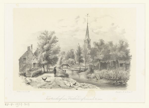 Curator: Immediately striking, isn't it? The artist has captured a serene yet ordinary scene with such precision. Editor: It certainly does. This drawing, dating somewhere between 1824 and 1874, is titled “Gezicht op Kortenhoef,” by Johan Diderik Cornelis Veltens. It seems deceptively simple— a detailed landscape made with pen, pencil, and ink, translated to print—yet I’m captivated by its formal elements. Curator: Deceptive is right. This isn't just a landscape; it’s a slice of 19th-century rural life. Kortenhoef was a popular spot for artists at the time, escaping urban centers. Consider who was allowed that luxury. This isn't merely representation; it subtly reveals the burgeoning leisure class. Editor: True, yet, the way Veltens manipulates light and shadow using delicate hatching and cross-hatching really makes this piece pop. Observe the intricate rendering of foliage and architecture. It's technically superb, creating depth and texture that elevate it beyond a mere sketch. Curator: The figures on the road offer narrative depth, subtly hinting at gender roles and social dynamics of the time. Notice who's strolling leisurely versus who is engaged in work. Consider the limited roles prescribed to women then. This impacts how we perceive not just landscape but the socio-economic terrain, too. Editor: You’re correct that the composition invites that analysis, however, without understanding the formal structures within, it would lack a key dimension. Consider how the horizontal lines of the road and bridge, contrasted against the verticality of the trees, give our eyes cues for perceiving perspective. Curator: Right, and that very perspective places the viewer as an outsider looking into a particular Dutch reality. Who gets to gaze upon this rural idyll and who is caught within it? Editor: It's precisely through this interplay of form and historical context that its visual language deepens and evolves. Curator: Agreed. Art, after all, demands we engage with its many layers. Editor: Indeed, it's through these multiple layers that meaning comes to the surface.