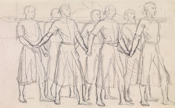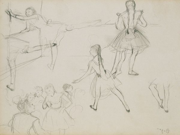 Editor: This drawing, titled *Skating* by Allan Rohan Crite, made in 1933, depicts a group of figures on what appears to be a frozen pond. The medium is pencil on paper, and I find myself intrigued by its focus on everyday life and community, yet something seems formally unresolved about it. What stands out to you when you look at this piece? Curator: It's a powerful image, especially when you consider Crite's dedication to depicting African American life in Boston during the early to mid-20th century. Remember that in 1933, while the Harlem Renaissance was waning, there was a growing need to capture and celebrate Black culture in different regions across America. Crite’s choice of a winter scene involving leisure – skating – disrupts stereotypes and highlights normalcy. Do you notice how he positions the figures? Editor: Yes, there's a distinct arrangement – a mix of figures skating and standing, a blurring effect that implies movement but the image still looks stiff and strangely formal. The Regionalist label makes more sense to me now as I start to consider the place where he lived. Curator: Exactly. The figures are interconnected, holding onto each other. Think about what that might signify socially and politically. During the Depression era, communal support and resilience were crucial, wouldn’t you agree? Furthermore, Crite actively pushed back against minstrel caricatures through the very act of painting Black individuals engaging in ordinary, dignified activities. Editor: So, by simply portraying Black people skating, Crite was making a social statement, challenging existing prejudices of the period. That's far more nuanced than my first impression allowed. I initially just saw a somewhat awkward composition. Curator: Precisely. And recognizing that shifts our understanding of the drawing. It moves from a mere depiction of skating to a powerful statement about identity and community in a specific time and place. The public role of art truly shines here, doesn’t it? Editor: It certainly does! Considering the historical context has given me a much richer appreciation for what Crite was trying to accomplish. It is amazing to learn more deeply the way social context impacted the way that artist created!