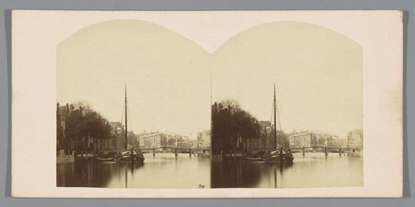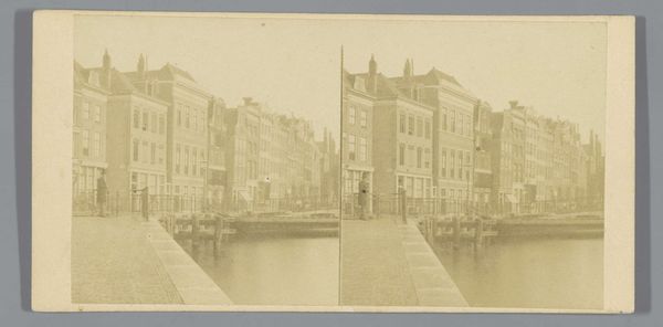 Curator: Today we are looking at "Sluis aan de Singel in Amsterdam, mogelijk de Haarlemmersluis" which translates to "Lock on the Singel in Amsterdam, possibly the Haarlemmersluis". It’s a daguerreotype by Charles-Henri Plaut from 1858. Editor: Immediately striking is the somber tone. It’s sepia-toned of course, being a daguerreotype, but the scene itself is still. Almost as if the color has been leached away, mirroring a stillness in the composition itself. The solidity of the stone structure at the bottom seems to ground the ethereal water and light. Curator: Indeed. The stone is not merely structure; the locks themselves hold immense symbolic weight. Amsterdam relied and continues to rely on them to control its relationship with water, the source of its power, trade, and potential ruin. It shows both prosperity and risk, wouldn’t you say? Editor: Absolutely. Thinking about how water functions here…there's almost a grid imposed upon its flow, wouldn't you say? We see that geometry of canal against the flowing of water. The near structure’s stark geometry strongly opposes any sense of the pictorial and dominates what is left of it. It gives it a certain harsh realism. Curator: The perspective also draws the eye far into the frame. Notice how the building facades begin to flatten the further back we go. It mirrors how the past fades but also continues to influence us; here you see continuity over time and generations reflected on the water and held by the stoic buildings on the right side of the scene. Editor: True. And even that subtle haze at the distant end of the canal works to compress the space while making one highly aware of the surface plane of the photograph itself. The structure has its effect but as a material object. Curator: It seems Plaut sought to capture more than just a place. It encapsulates a city’s history in a single frame. It captures something real but also a certain nostalgia and memory. Editor: Agreed, the more I look at it, the more I sense that intersection of rigid structure and fluid motion defines not only the composition, but also, as you pointed out, the very essence of Amsterdam's existence, its ongoing dance with nature.