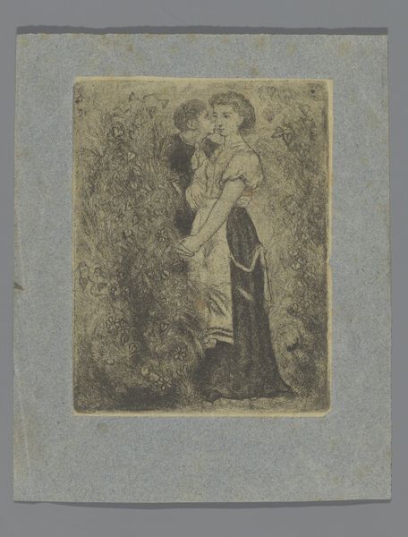 This etching, *Zittende man met baret en dolk*, was created by Willem Linnig II in 1886. Notice how Linnig uses a dense network of lines to build up the image, creating a compelling interplay of light and shadow. The composition, although small, suggests a much larger world through its textured details and nuanced contrasts. The subject, a seated man in elaborate attire, is rendered with a focus on costume and adornment, which gives us insight into the era's values. Here, the man's clothing, particularly the baret and dolk, are not mere details, but rather signs loaded with cultural significance. They speak to notions of status, identity, and perhaps even power. Linnig's focus on these elements challenges viewers to consider the semiotic codes embedded in the artwork, and how these communicate complex meanings beyond the mere depiction of a figure.