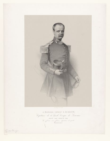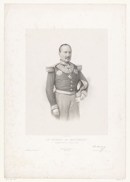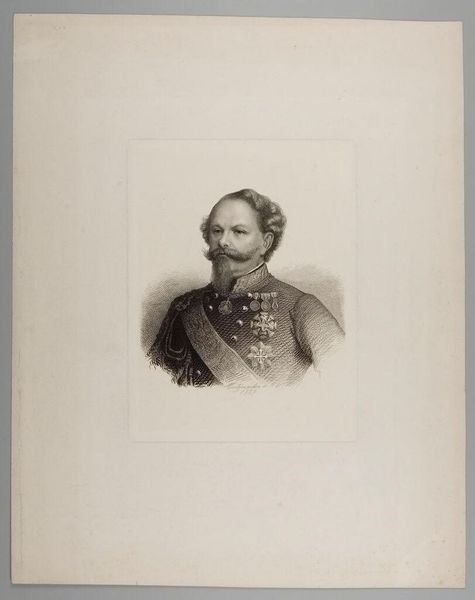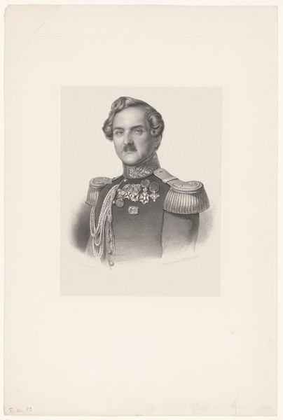 Curator: Here we have a drawing from approximately 1851 to 1883, entitled “Portret van Théodore Guillaume Thierry Victor de Constant Rebecque”. Editor: Oh my, he looks awfully serious! The kind of seriousness that could curdle milk, you know? Lots of fancy embellishments on that uniform though. A certain crispness in those lines as well! Curator: Indeed. The artwork is done in pencil, and we see a man of status, most likely within a military context given the regalia. Let's consider this portrait within a broader framework of 19th-century power structures, especially regarding military figures and their influence. Editor: Well, those medals probably jingled quite merrily when he walked! It does strike me that it must've taken forever to render all that detailing with pencil, it's amazing how delicate and precise some areas are. Can you imagine posing for so long? Curator: Consider also, how portraiture served to solidify identities and legitimize power. The choice of medium, pencil, is interesting – more intimate, perhaps, than oil, yet still conveying authority through careful execution. We might examine this in light of social expectations placed on military leaders and how their image was carefully crafted. Editor: Right? So the message really depends on the artist as well, don't you think? All the power stuff is important, but this feels softer somehow. The overall effect reminds me of a finely-etched memory or a ghost captured on paper, and I love the gentle shadowing. Curator: The artist clearly worked with a vision to showcase the figure, however they may be perceived, so both of our impressions have truth to them. The subtleties in the shading definitely give it that sense of life—even if that life is laced with stern purpose. I think it leaves space for contemplation about how identity and authority intersect within the confines of artistic representation. Editor: Agreed! Thinking about how images speak even when we're not around to hear them adds a nice layer, doesn't it? Thanks for drawing those out with me.