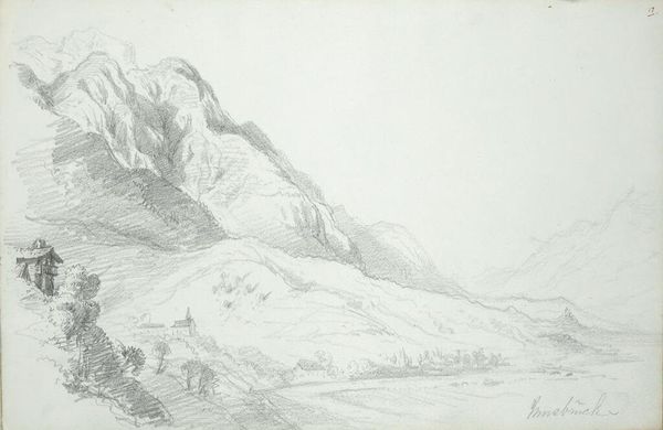 Curator: Welcome. Before us lies "Sketches of alpine ranges in Switzerland" by Józef Simmler, created in 1856 using pencil and ink. What are your initial thoughts? Editor: There’s something stark and lonely about it. It's primarily grayscale, depicting mountainous terrain that fades into the sky, making it look quite empty. A bit foreboding, really. Curator: The artist's choices are interesting. The medium itself, humble pencil and paper, speak to accessibility and portability. This could have been created on-site during his travels. Did he have a patron for the journey, who funded this practice? Editor: Possibly. Landscape art in this period reflects ideas about nationhood, especially in Switzerland, which was consolidating its identity in the mid-19th century. Did these sweeping views inspire notions of collective pride, of belonging? Also, the lack of human figures prompts questions about who gets to access this landscape, and what labour sustains its viewing. Curator: Indeed. And look at the technique—the repetitive, almost hurried lines used to create shading and texture. Perhaps that reflects the actual labor involved in representing such expansive scenery within the confines of the page. It's not about illusionism here, it’s more focused on observation and translation. What do you suppose was he aiming for? A memento for himself, or something more? Editor: Maybe it was both personal and political. Remember, Simmler was Polish, but studied art in several European academies, so his lens is interesting. Considering issues of imperialism and how travel could signify privilege and access to certain spaces during this time might provide further context to this and to Simmler’s cultural positioning. Curator: Absolutely, by choosing the relatively immediate and accessible mediums of pencil and paper, we see that Simmler makes no claims about an elevated vision; instead, this artistic practice situates him within an empirical process of looking, collecting data, and drawing conclusions in order to render what can't literally be captured in total. It is almost like visual knowledge gathering for a rising country. Editor: Ultimately, this seemingly straightforward drawing holds layered stories of nationhood, access, labor, and the very act of seeing and representing a space, a set of circumstances, which provides access to its many histories. Curator: And from a materialist perspective, it reveals how even the simplest tools, employed during exploration or nation-building, contain both practical application and complex social values within its production, the paper it's printed on and the source from where they're created.