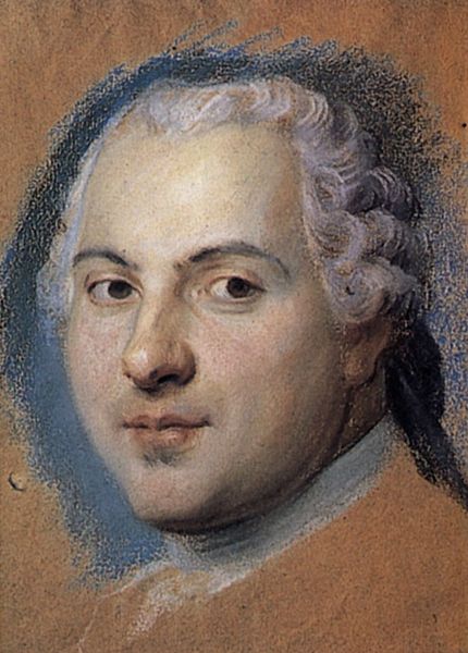 This is Maurice Quentin de La Tour's study to the portrait of the magistrate Jacques Laura Cooper Breteuil. It is made with pastels, where the subject's composed gaze immediately draws you in. The artist's choice of medium and technique is particularly striking. La Tour's deft use of pastel creates a soft, almost ethereal quality, especially noticeable in the magistrate's face and powdered wig, contrasting with the rougher, sketch-like quality of the background. The color scheme is muted, dominated by earthy tones, which gives the portrait a sense of intimacy and warmth. What's fascinating here is how La Tour destabilizes the traditional formality of portraiture through his technique. The visible strokes and unfinished sections expose the process of creation, inviting us to consider the artifice of representation. The materiality of the pastel becomes integral to the artwork's meaning, blurring the line between the subject and its representation. Ultimately, the artwork becomes a site of ongoing interpretation. We're left to ponder the relationship between the surface appearance and the underlying structure of both the artwork and its subject.