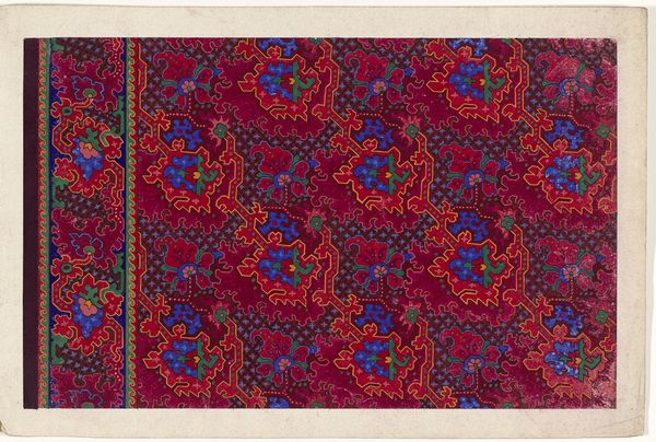 This is a carpet design made anonymously using an unknown medium. At first glance, the work assaults us with a riot of curvilinear forms, dominated by the paisley motif, in shades of red, pink, and burgundy. The composition reveals a complex interplay between repetition and variation, with each paisley subtly differentiated, challenging the very notion of identical replication. The artist, through a rigorous organization of shapes and colours, compels us to consider the carpet not merely as a functional object, but as a structured field of visual signs. The slight shift in tone and saturation across the surface hints at a deeper engagement with the material properties of dye and fabric. The strategic placement of contrasting colours within the paisley shapes disrupt conventional expectations of harmony, inviting us to question the established hierarchies of visual pleasure. It is an exploration into the nature of patterns and decoration, challenging us to reconsider our relationship to the familiar.