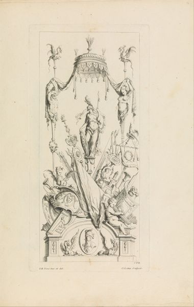 Curator: Before us, we see a design conceived by Gabriel Huquier between 1725 and 1750: "Ontwerp voor een ornamentele fontein met nimf en satyr," a work rendered in etching and engraving. Editor: It strikes me as almost weightless, ethereal. The delicate lines give it a dreamlike quality, as if this grand fountain exists only in the imagination. Curator: Indeed. Huquier was not the original artist but an engraver who reproduced designs by others. Here, he showcases the rococo fascination with playful elegance, intended, perhaps, to circulate ideas among wealthy patrons considering garden follies. The social function of prints at the time cannot be overstated. Editor: And that playful elegance is everywhere, isn’t it? Consider the eagle perched atop the fountain, a symbol of power made whimsical, juxtaposed with the figures of the nymph and satyr. There’s a clear invitation to explore sensuality, an erotic undercurrent expressed within the mythological themes that permeate much of Rococo art. What do you make of that relationship between overt power symbols like that bird of prey with softer representations of eroticism here? Curator: It speaks to the period's social hierarchy, perhaps unintentionally. The wealthy, the 'powerful' eagle if you will, are those for whom earthly pleasures were abundantly available. A carefully constructed visual world affirmed their societal status. Fountains themselves were a form of urban display. Editor: The water spurting from the monster’s mouth adds to that idea of abundance – a sense of the life force gushing forth, tamed by design, wouldn't you agree? Fountains were so central to how elite members of society presented themselves. They acted as almost psycho-spiritual landscapes. Curator: Precisely. It signifies control and luxury, concepts carefully promoted by those in power. Looking closer at this etching, it demonstrates how those concepts spread from urban centers. Editor: Ultimately, even a design sketch such as this offers such insight into the culture. Curator: Precisely, this relatively humble engraving expands our view of 18th century culture beyond the palace walls.