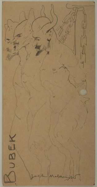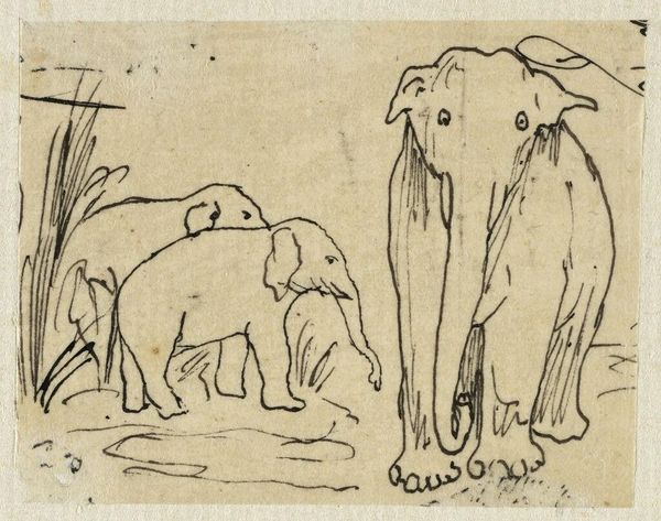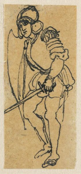 Curator: This is "Man in a Turban on a Camel" by Rodolphe Bresdin. Editor: It's so small! I'm immediately drawn to the stark simplicity of the line work against the warm ground. It feels almost like a printmaker's proof. Curator: Bresdin, born in 1822, was indeed a master printmaker. The turban itself acts as a potent symbol of identity and cultural difference, doesn’t it? Editor: Absolutely, but I’m also wondering about the labor involved in making such a tiny, detailed piece. What kind of tools were used, and who would have been the audience for this? Curator: Perhaps it speaks to our fascination with the exotic, or even a yearning for a simpler, nomadic existence. Editor: Possibly. I'm mostly intrigued by the artist's hand. How much pressure was exerted to leave these lines? Curator: It gives one pause to consider how such a small image can hold so much, doesn't it? Editor: Indeed. Now I can appreciate the artistry and the labor.