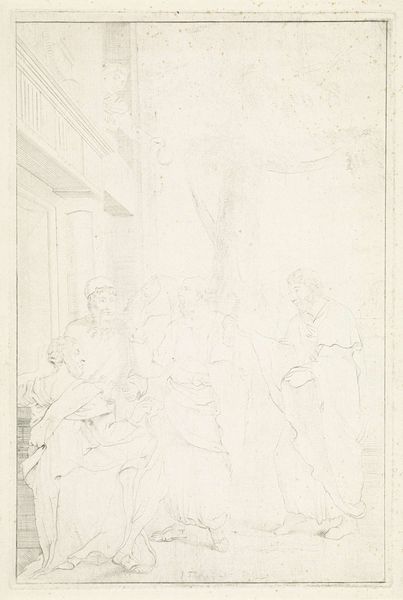 Curator: Joseph Highmore, active in the 18th century, gives us "A Group of Four Persons and a Dog in a Garden," a drawing held at the Tate. I am struck by its delicacy. Editor: It has a ghostly quality, doesn't it? Such faint lines and attenuated figures, grouped against classical architectural forms. Curator: Look at how Highmore uses the subtle variations in line weight to suggest depth and volume. The composition, though sparse, achieves a balanced asymmetry. Editor: This drawing feels like a stage setting for a social drama. The dog, almost like a prop, emphasizes the artificiality of this constructed space. Curator: The artist employs an almost mathematical precision to create a harmonious whole. The negative space is as essential as the marks themselves. Editor: And perhaps reflects the social structures of the time, the roles assigned and performed within these elite gardens. What a fascinating little insight.