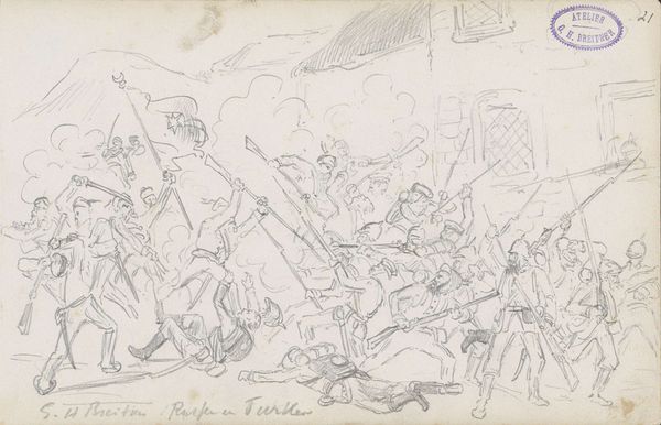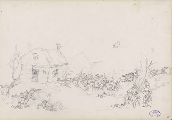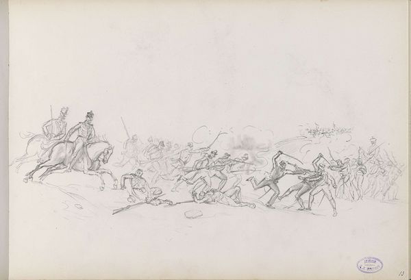 Curator: Look at this swirling sketch. At first, I thought it was smoke, but it's dynamism. I’m immediately sucked into a world of chaos, like watching a memory resurface. Editor: Indeed. We’re looking at "Attack of French Cavalrymen on German Soldiers," a pencil drawing from 1872 by George Hendrik Breitner, housed here at the Rijksmuseum. It’s interesting to consider this work alongside Breitner’s later, better-known paintings. It serves as a study, a prelude to his gritty cityscapes. Curator: A prelude is perfect! There is something haunted about it. War as fleeting. This drawing feels so immediate; you see the artist working to capture that essence—motion and dread mixed together. I love how loosely everything is defined—especially in the upper section where that church rises distantly, untouched by the immediate turmoil of ground battles. Editor: Exactly. Note the specific historical context too: this captures the Franco-Prussian War. We have here Breitner engaging with history painting, a genre often used to bolster national narratives, yet here Breitner complicates things. I feel it conveys an unease that challenges romantic notions of warfare. What side is truly "winning" when violence and trauma reign so obviously supreme? The tower seems like some silent god observing mankind with dismay! Curator: God or history maybe? The church looming over, perhaps representing a long history of these battles, while down here, men clash and struggle. Breitner creates a scene devoid of clear victory, presenting us instead with this exhausting, eternal loop. No one truly gains here, which is more poignant when rendered so deftly! Editor: Agreed. This approach really humanizes these nameless soldiers, forcing us to reckon with the physical and psychological tolls of such battles. The seemingly detached, quick sketches amplify the cruelty. No honor, no heroes—only desperate bodies caught in the act. Even the act of drawing itself feels violent: quick, unforgiving, with very few revisions. Curator: That immediacy… captures so much about violence and transience. What to extract when confronted with such devastating moments? Perhaps art can never truly hold all meaning when grappling with horrors of history. What this composition does best is offer glimpses into a bottomless well: where uncertainty dwells as final resting point to any grand heroic narratives! Editor: Ultimately, it serves as an important reminder about the lasting impact conflict imprints across generations; offering glimpses of an eternal trauma loop that can never be definitively put to rest through aesthetics!