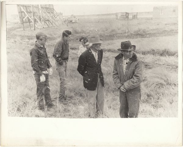 Editor: So, here we have Robert Frank’s gelatin silver print, "Car accident—U.S. 66 between Winslow and Flagstaff, Arizona," taken in 1955. It’s stark, bleak, and undeniably unsettling. There's a body covered by a blanket in the foreground, and a group of onlookers standing behind. What do you see as you examine this photograph? Curator: Frank's image confronts us with the harsh realities often glossed over in the romanticized narrative of 1950s America. The title explicitly points to U.S. 66, a road laden with symbolism as the "Mother Road," but instead of freedom and opportunity, we are presented with an abrupt disruption, a stark depiction of mortality. Consider how the very act of photographing such a scene transforms it from a personal tragedy into a public spectacle, inviting us to reflect on our relationship with violence and disaster. Editor: That makes me consider the people standing behind the body... who are they? Are they just passersby, or connected to the accident? It feels like we are meant to think about what it means to witness tragedy. Curator: Precisely. This is part of Frank’s genius – he leaves so much ambiguous. It forces us to question our role as viewers, our desire for narratives, for answers that aren't provided. It highlights the voyeuristic element in photography itself, particularly documentary photography. How complicit are we, merely by looking? Think about how this image challenged the established photographic norms of the time, its grainy, unpolished aesthetic signaling a break from traditional photojournalism. Editor: I hadn’t considered that the medium itself could be challenging those established norms! Curator: Photography doesn’t simply reflect reality. It shapes it, interprets it, and can be used to critique societal norms and power structures. What is acceptable to view publicly and privately shapes how we approach photography and trauma today. Editor: I see what you mean. I went in thinking this photo was about one specific accident, but I’m leaving with a deeper consideration for the broader public impact of this single frame. Curator: Exactly, this image is a reminder of art's ability to unsettle and provoke, encouraging critical reflection.