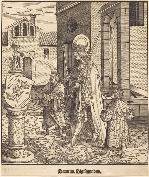 Curator: Check out this arresting woodcut, "Saint Remigius" by Leonhard Beck, created around 1510. What grabs you right away? Editor: It feels so serious, so rigidly posed. All those sharp, dark lines carving out this imposing figure. It's almost intimidating, isn't it? Like he's about to pass judgment or something. Curator: The precision is incredible for a woodcut of this era, a testament to the meticulous skill needed to carve those tiny, telling lines. The print emphasizes St. Remigius, not only a saint but the Bishop of Reims who famously baptized Clovis, king of the Franks, marking a turning point in the history of Christianity. Editor: The symbols, though! Talk about overloaded! The halo, of course. That weird mask thing hanging in the background, and is that his personal heraldry at the base of the throne? And what's that little pile on the floor in front? Curator: Indeed. Those emblems tie the figure to cultural memory. The Vera Icon hanging behind is associated with the legendary Veil of Veronica, used to wipe Christ's face on the way to Calvary, preserving the true likeness of Jesus, an especially meaningful symbol within certain strands of Medieval art and religion. The heraldry, too, reinforces his rank and ties him to specific territorial and familial identities. And you picked up on that round thing. It looks a little like a weird sponge, and no one really knows what it is! Editor: That weird sponge is so strange that is distracting me to the rest of the print. To think about the historical, spiritual, and personal symbols embedded in this single image, how these forms and tokens acted as visual shorthands for deeper beliefs and associations. Curator: The continuity, or transformation, of specific images offers a thread connecting this individual piece to something broader—not just art history, but cultural history. What we choose to depict, how, and why, reveals layers of information, especially concerning social status. Editor: Right! Art as archive, as message-in-a-bottle. A surprisingly severe but, you know, meticulously and even lovingly rendered message in this instance, right? All those tiny lines lovingly carved to ensure a specific understanding... Amazing! Curator: A revealing journey through symbols and artistic skill. A deep dive into belief and craft!