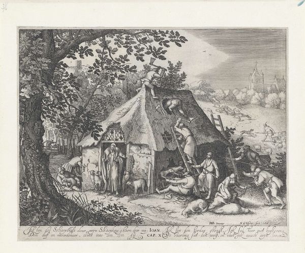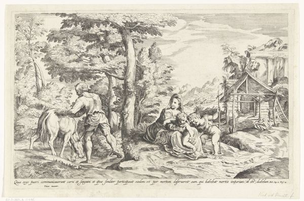 Pellegrino dal Colle created this print titled "Herders met kudde en boerinnen" in the late 18th century. It offers a glimpse into the pastoral ideals of the time, yet it also subtly reveals the socio-economic realities of rural life. The artwork depicts men, women and children tending to their animals, in what seems like idyllic harmony. But look closer. The division of labor is subtly marked by gender and age, with women and children actively working, while a man reclines. The print reflects contemporary notions about labor, family, and social hierarchy during a period of significant social change. Is this really a scene of peaceful pastoral life, or is it just a romanticized version intended for a privileged audience? Notice how dal Colle invites you to contemplate the values and assumptions embedded in these images of rural life. It challenges us to consider whose stories are being told, and how they are being framed.