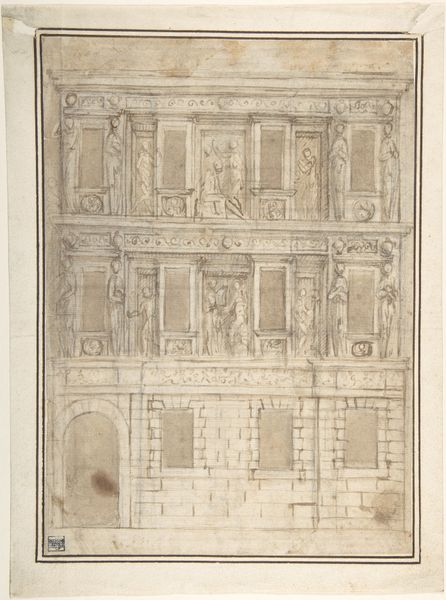 Editor: Here we have "Design for a Façade," an ink and engraving print dating from somewhere in the 18th century. The artist, so far, is anonymous. I'm immediately struck by the balance and symmetry of the piece. The intricate ornamentation makes me wonder how it would function architecturally. What aspects of the composition stand out to you? Curator: I’m drawn to the formal interplay of the flat, almost diagrammatic representation against the illusionistic depth created through hatching and cross-hatching. Consider the structure: the composition divides itself into distinct horizontal registers. Note how the artist utilizes the contrast between smooth, undecorated surfaces and heavily ornamented areas to direct the eye. What effect does this create? Editor: It guides the viewer, highlighting certain elements over others, I guess. Like the figure at the center! It is far more detailed and draws my attention right away. Curator: Precisely. The figure, rendered with more volumetric presence, acts as a focal point. Now, consider the vocabulary of forms - the arches, the scrolls, the cartouches. Each element contributes to a sense of controlled dynamism. Do you perceive a hierarchy within these ornamental forms? Editor: Definitely. Some are much simpler than others. Curator: The design suggests a calculated approach to visual communication, wherein form dictates function and vice versa. In other words, meaning emerges not from explicit symbolism, but through the arrangement and treatment of visual elements themselves. Editor: That makes perfect sense. I initially approached it as a pure representation, but now I see that the real interest is in how the parts relate. Thank you. Curator: Indeed. It demonstrates how much can be gleaned simply from studying intrinsic artistic properties.