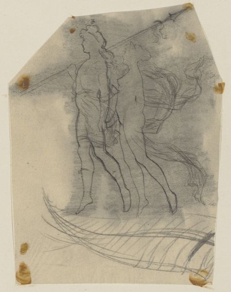 This study of Oberon and Titania was made by Paul Konewka. The delicate graphite lines on this thin sheet create a scene of ethereal lightness, almost as if the figures are barely tethered to our world. Konewka uses line to suggest form and movement. The figures are rendered with minimal shading, their bodies defined by elegant contours. The composition is divided into two distinct zones: Oberon hovers above, while Titania reclines below, their positions hinting at a dynamic relationship. The circular shapes that encircle the figures lend a dreamlike quality to the scene, abstracting them from conventional space. This drawing operates as a field of signs. The characters are part of a cultural code familiar to Konewka's audience, inviting an interpretation of the power dynamics suggested by the figures' placement. The drawing challenges fixed perspectives and acknowledges the multifaceted nature of representation. Notice how the fragility of the paper is not just a material fact but enhances the insubstantiality of the fairy realm, inviting us to contemplate the transient nature of meaning itself.