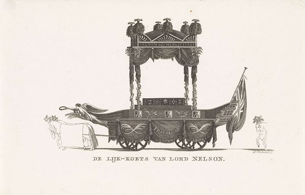 The Brothers Spyker created this print of 'The Golden Coach' in 1898, using a monochromatic palette to bring into focus the carriage's intricate design. The composition centres on the coach, allowing its elaborate embellishments and circular wheels to dominate the visual field. These circular forms create a rhythm that is only interrupted by the rectilinear shapes that frame the royal occupants. The lack of colour here encourages us to closely consider the structural elements of the coach, and how its visual rhetoric evokes notions of status and power. The detailed rendering of the coach, with its fine lines and precise shading, not only showcases technical skill but also elevates the coach to an icon. Consider how the print’s emphasis on the object as a symbolic form engages with broader debates around representation and value. Does it reinforce traditional hierarchies, or does it open up spaces for new interpretations and critiques? Ultimately, this image invites us to reflect on the complex interplay between aesthetics and ideology, and the enduring power of objects to shape our understanding of the world.