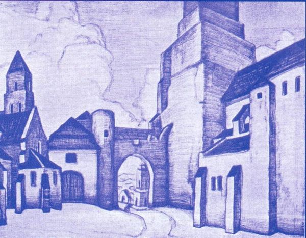 Editor: Here we have Nicholas Roerich’s oil painting "Repentance" from 1917, currently housed in the Nicholas Roerich Museum. The subdued palette and heavy snowfall really give it a somber, almost mournful, feeling. How do you interpret the composition? Curator: It's fascinating how Roerich uses form to evoke such strong emotion. The painting is dominated by the architecture. The monumental forms create a dialogue between permanence and fragility, especially when juxtaposed with the falling snow, which partially obscures and softens the angularity. Have you considered how the light functions here? Editor: It’s interesting you point that out because the shadows feel very stark. I’m drawn to the solitary figure by the steps; their darkness almost seems to disappear against the church walls. Curator: Precisely. Notice the strategic placement of the figure in relation to the building’s mass, suggesting an encounter with the divine or perhaps spiritual contemplation. The color palette is certainly constrained, mostly dark tones; it's the textural brushstrokes building the facade which introduce visual intrigue. Roerich uses repetition and variation through small window groupings which, from a formal perspective, contributes to both harmony and visual rhythm across the composition. What do you make of that visual strategy? Editor: Now that you mention it, I think I was missing the intention. I had perceived the composition as a bit oppressive but I now see how the visual rhythm gives the structure almost a life-like essence, even if that life is quiet. Curator: Indeed. The strategic manipulation of artistic elements such as texture, tonal control and monumental shapes can convey emotions very intensely and are really engaging formal achievements in symbolist landscape. Editor: I now have a better sense of how the starkness I felt in the color actually allows for Roerich’s compositional techniques to have a more direct and affective presence. Thanks for elucidating.