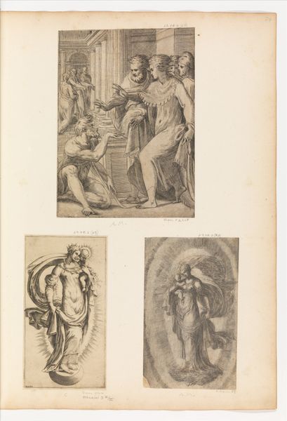 Curator: This intriguing print is titled *Venus and Cupid* and comes to us from the Italian Renaissance, created sometime between 1520 and 1530 by Giacomo Francia. Editor: It’s striking how the figures emerge so directly from the cloud forms. It gives the work a wonderfully ethereal yet immediate presence. Curator: Yes, there is an inherent power in the classical subjects depicted within. Venus, the Roman goddess of love, beauty, and desire, alongside her son Cupid who, of course, is widely known as the god of affection and attraction. Editor: Speaking to structure, consider the vertical emphasis. The upward gaze Venus directs guides our eye heavenward, reinforced by the flowing drapery behind her, creating a dynamic contrast with the grounding cloud beneath her feet. The artist has established the semiotic framework around Venus by subtly presenting her control over the very figure of Love. Curator: Certainly. Note how Venus holds the arrow, an iconic symbol often wielded by Cupid. Here, it subverts expectation—it signifies a layer of dominance and speaks to her multifaceted role as not only a mother but also the orchestrator of passion itself. Her gaze doesn’t suggest tender warmth; it’s cool, assessing. Editor: The monochromatic etching really allows the textural variations to shine; from the smooth, idealized skin of Venus, contrasted to the feathery lightness suggested in Cupid's wings. These textural contrasts speak volumes. Curator: Beyond pure visual aesthetics, this piece offers insights into Renaissance perceptions of love—often complex and not solely defined by sentimental affections. Here, it is almost as if divine beauty and impulse meet, which may challenge some present-day understandings. Editor: I agree completely; this print invites closer observation that unfolds over time through shape, form, and shading to subtly influence emotional meaning. Curator: Indeed, reflecting on this work highlights not only Francia’s artistic talent but also cultural attitudes of that period regarding romance, motherhood, and godly authority. Editor: Yes, an example of how studying the formalism unlocks such potential for broader iconographical interpretations, and vice versa.