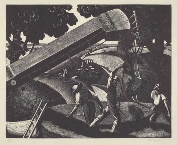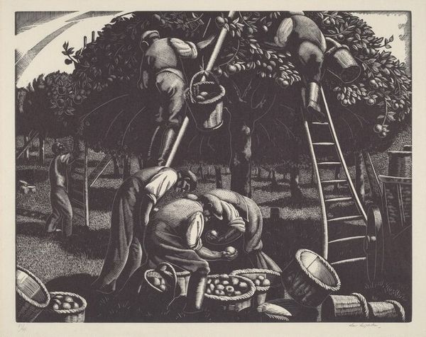 Clare Leighton created this wood engraving, "Loading," using a painstaking method of carving an image into a block of wood, inking the surface, and then printing it onto paper. The stark contrast between the cut and uncut areas creates a dramatic interplay of light and shadow. Leighton's choice of wood engraving underscores the relationship between the artwork and its subject. Notice how the linear quality of the engraving mimics the texture and form of the logs being handled by the laborers. The process requires considerable skill, patience, and physical labor. The print provides a commentary on the relationship between human effort and the natural world. In highlighting the strenuous activity of loading logs, Leighton draws attention to the physical labor involved in the production and consumption of resources. This challenges the traditional hierarchy between fine art and craft, emphasizing the value of the materials, making, and context in understanding its full meaning.