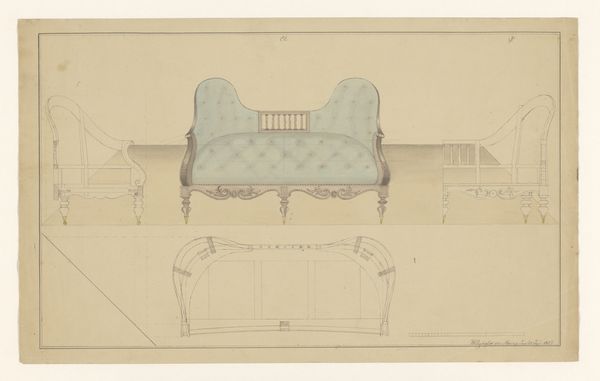 This is an architectural drawing of an upholstered armchair with cheeks and copper legs on casters by B. Winghofer. Executed in an indeterminate time, the work is articulated through watercolor and ink on laid paper. What immediately strikes you is the structured layout. The artist presents the armchair in two distinct views: a side profile and a frontal perspective. Below, two plan views offer a bird's eye depiction of the chair's structure. The composition is defined by a subtle but deliberate use of lines and planes. Faint dotted lines in the backdrop appear to offer an implied spatial context. The color palette is muted, emphasizing the linearity and form of the design rather than its decorative elements. The artist focuses on geometric precision and structural clarity, which speaks to broader concerns within design for functionality and spatial harmony. This drawing presents a piece of furniture, but does so through the language of architectural and engineering precision.