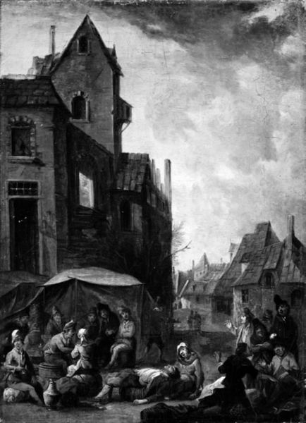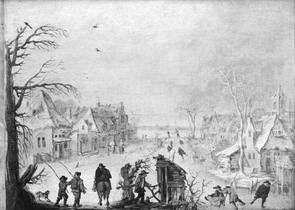 Thomas Heeremans created this small oil on panel painting, Winter Scenery, sometime in the late 17th century. The painting invites us into a muted world where a rigid architectural structure looms over a busy frozen landscape. The near monochrome palette, primarily greys, whites, and blacks, enhances the geometric forms of buildings and figures, creating a stark, wintry atmosphere. Heeremans masterfully balances the composition between the imposing architecture on the left and the lively figures skating and sledding on the frozen river to the right. The buildings’ strong vertical lines contrast with the dynamic diagonals of the figures in motion, creating a visual tension that animates the scene. The textures, rendered with visible brushstrokes, add depth and a tactile quality, inviting the viewer to imagine the cold, crisp air. Ultimately, the painting is not just a representation of a winter scene but a study in the formal contrasts between stasis and movement. It is an exploration of how geometry and texture can evoke a deeper sensory and emotional experience.